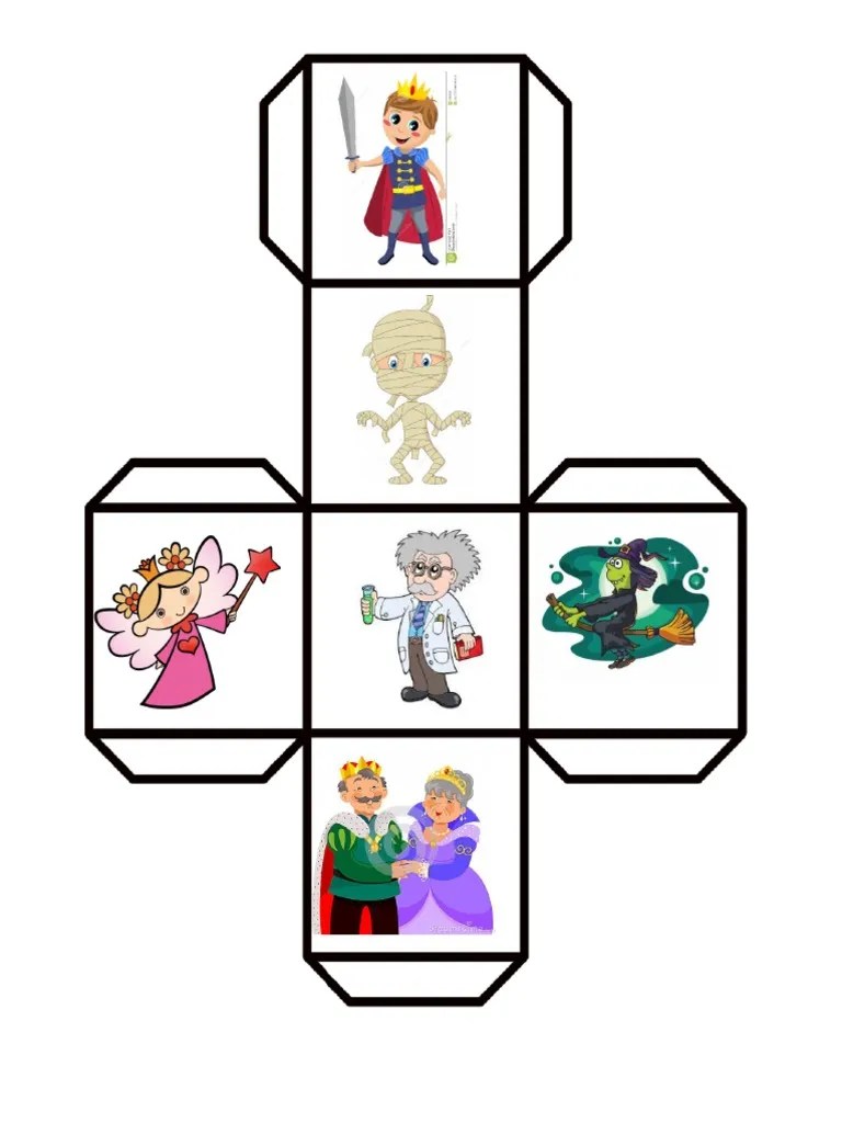 Se trata de realizar cubos para inventar cuentos. Que nos dé pie a desarrollar un cuento sin necesidad de incluir otros agentes. Extraterrestres momia bruja rey prncipe/caballero.